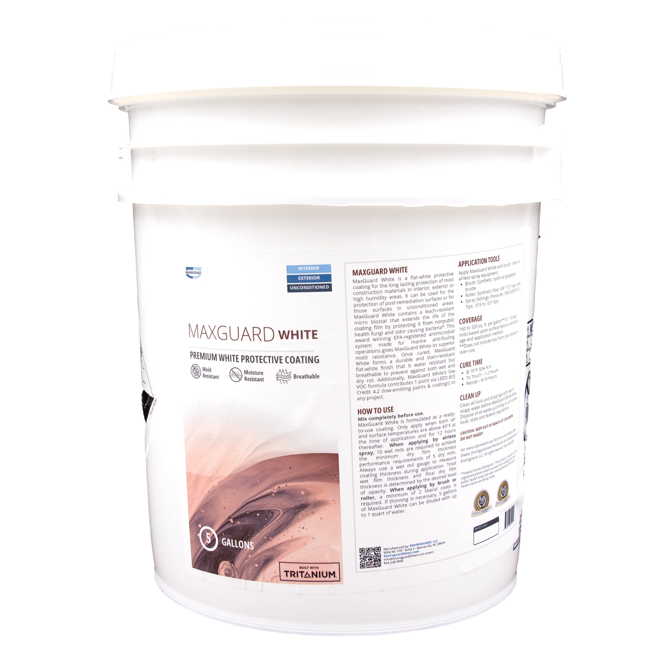 MaxGuard is formulated as a ready to use coating. It can be applied with a brush, roller, or airless sprayer to obtain an even finish. Do not apply past the point of run off. A cross hatching technique is the best way to ensure sufficient wet or dry film thickness and complete coverage. Consult the Enviroguard New Construction Warranty and Enviroguard Existing Construction Warranty documents for details.