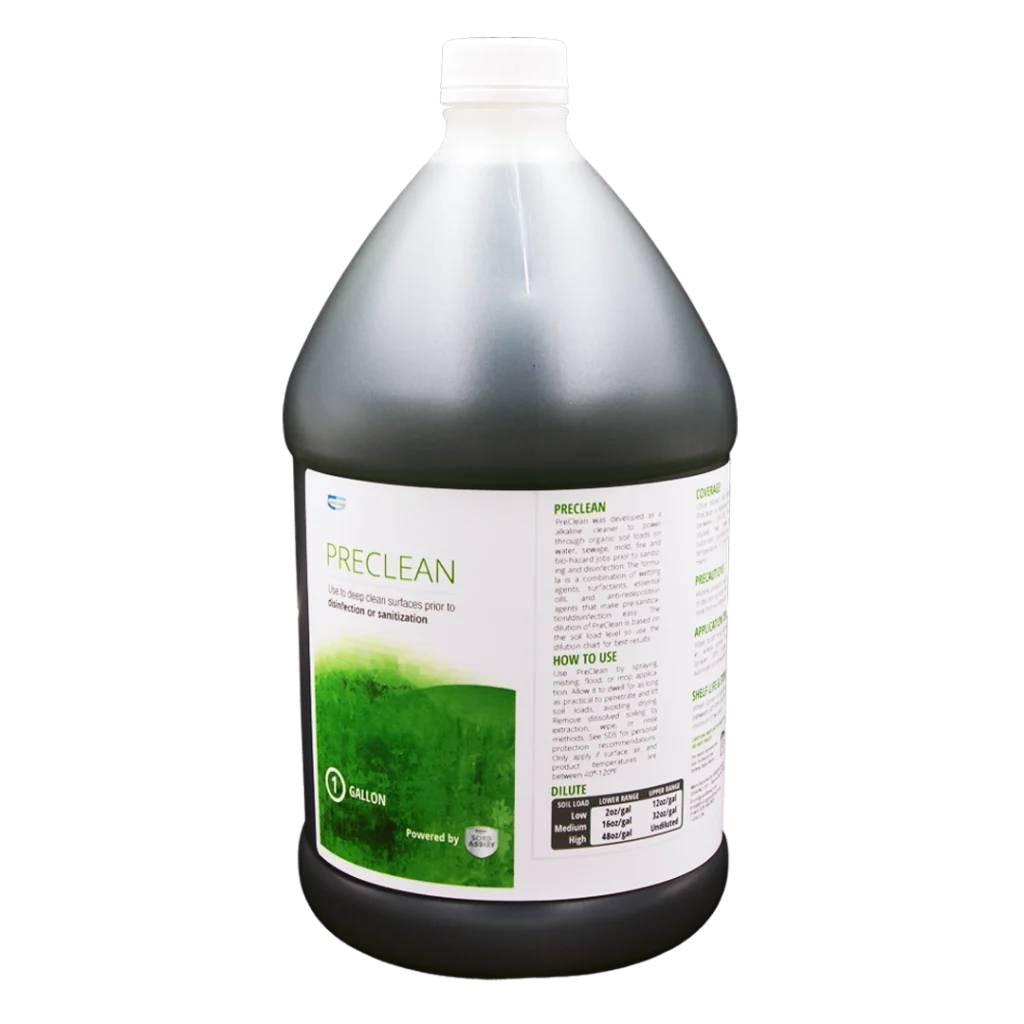 Try using our PreClean to clean the surfaces. PreClean’s combination of wetting agents, surfactants, and anti-redeposition agents makes the pre-sanitization/disinfection cleaning of low, medium and heavy soil loads on porous, semi-porous, and non-porous surfaces easy and fast.